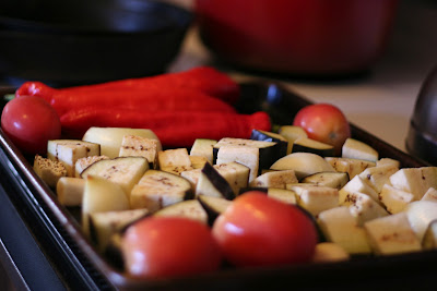Watch the vegetables since the eggplant and tomatoes will be done sooner than the red peppers.